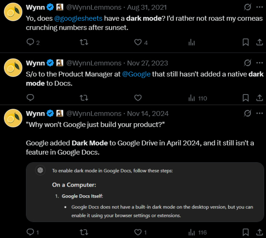 I have a long standing beef with the fact that neither Google Docs nor Google Sheets have a native Dark Mode. It’s 2025, we’re inventing god intelligences to annihilate humanity in the next few years, and Google still hasn’t added these basic features. Wild. This is an imminently solvable problem. Yes, I know chrome extensions like Dark Reader exist, but in our imagined future this fix would be merely a prompt away.