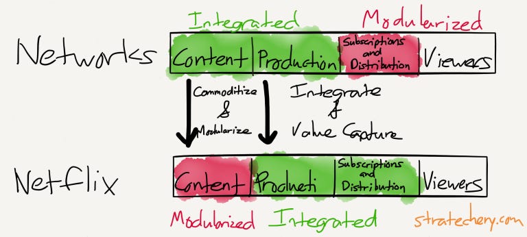 Netflix was a disruptive aggregator that thrived by modularizing content while integrating production, subscriptions, and distribution:
